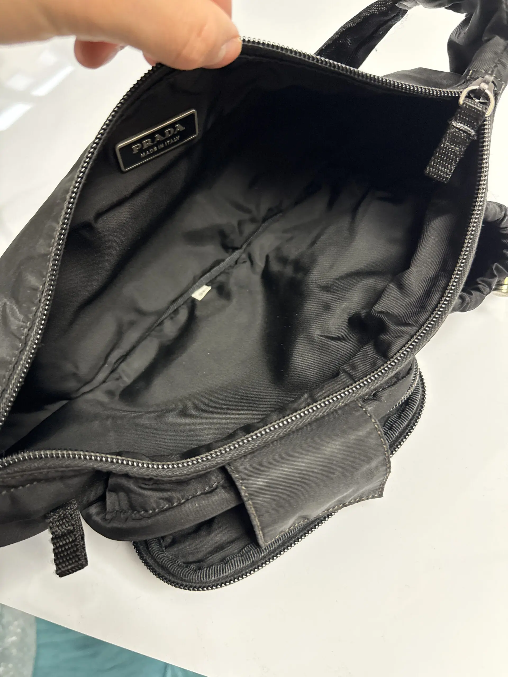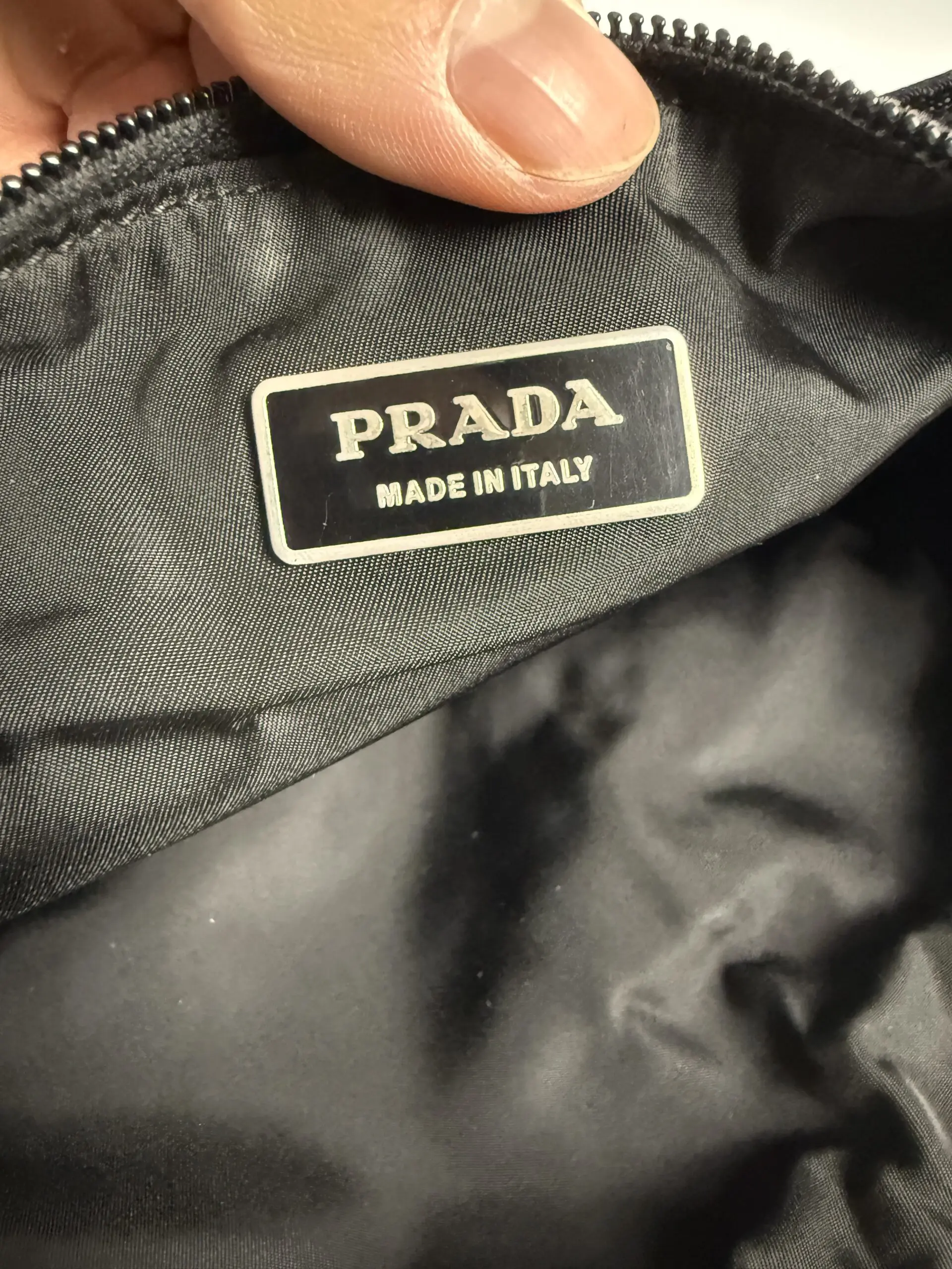 Kompakt Prada-model i sort nylon med det klassiske trekantlogo.
