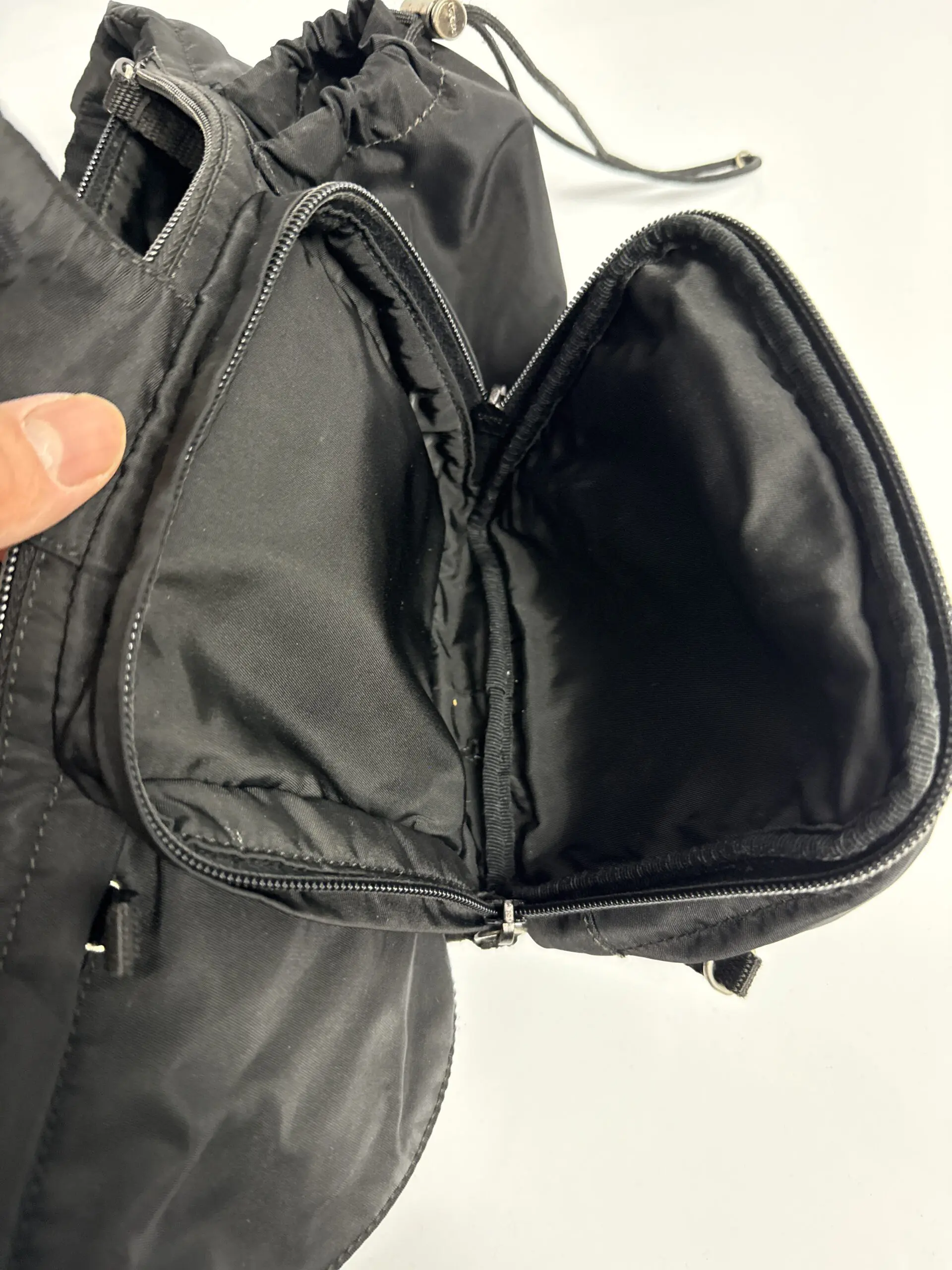 Tasken er brugt med slid på nylon, men intet væsentligt. Den er professionelt syet ved siden af den mellemste lomme.